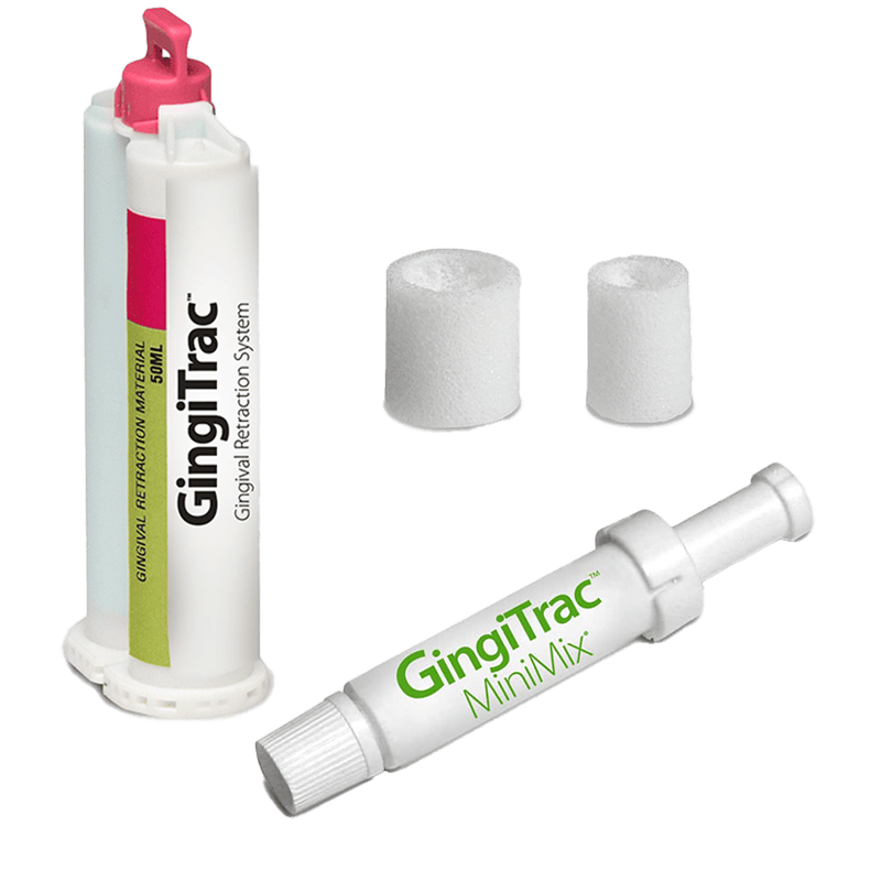 GingiTrac is a medium-viscosity, vinyl polysiloxane (VPS) gingival retraction paste with 15% ammonium aluminum sulfate (alum) that gently displaces the gingiva from the tooth and stops bleeding. When used with GingiCap compression caps, the mechanical bite pressure of GingiCap combined with the astringent action of aluminum sulfate works to control bleeding and seepage in just minutes. GingiTrac cleans up easily and completely, without tissue trauma.